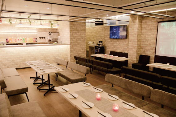 カウンターと全席ソファーのカーテン個室があり、立食パーティーやイベント形式にも対応可能。