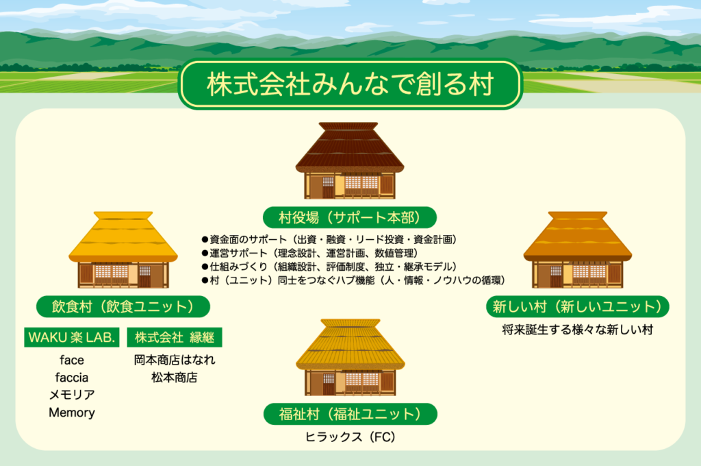 株式会社みんなで作る村という「大きな村」の中に、「小さな村(ユニット)」がいくつも存在するイメージです。